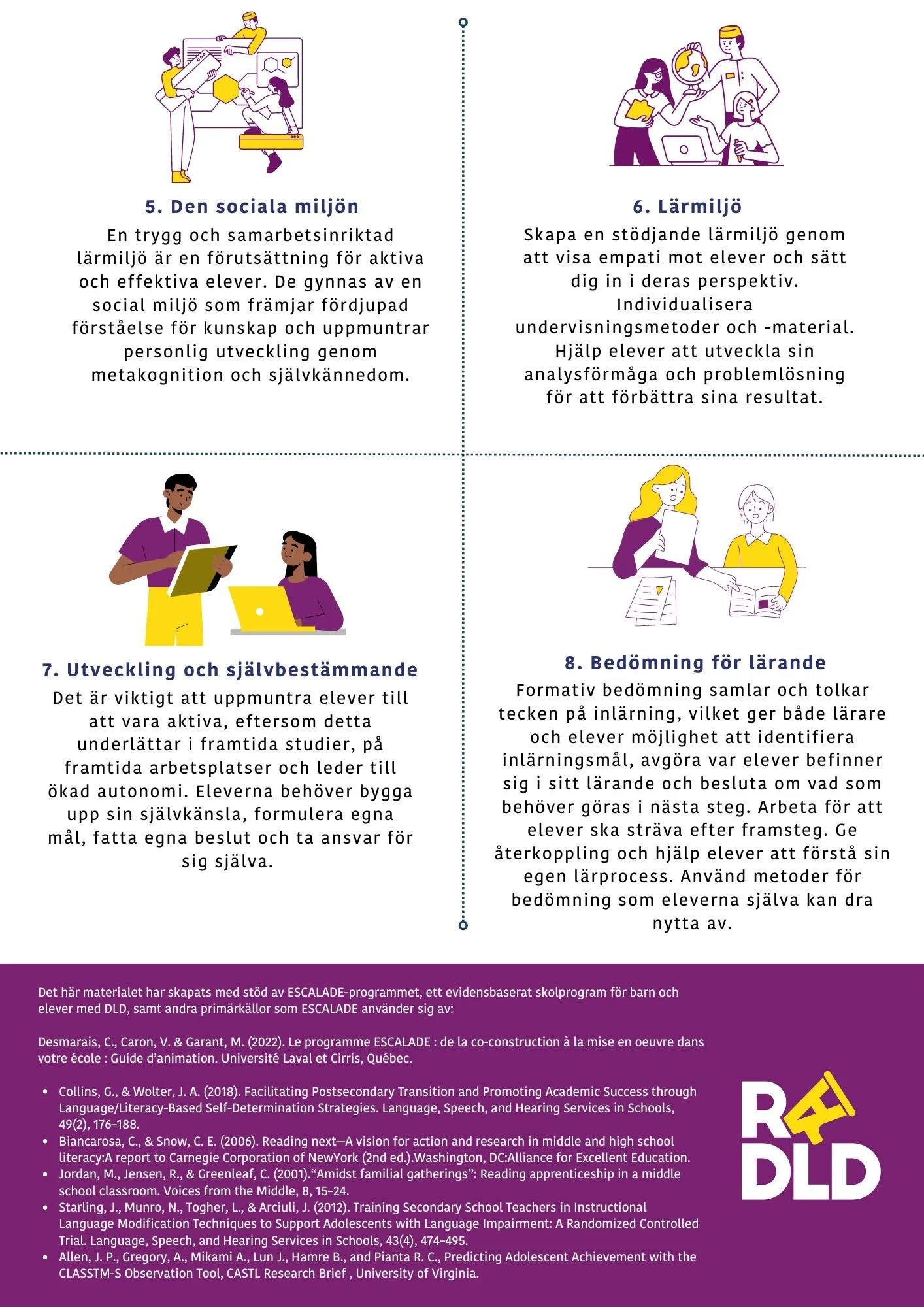 De följande fyra råden fokuserar mer på lärmiljö, social miljö, elevers egna röster och självbestämmande. Otroligt viktigt att även dessa aspekter lyfts - ibland blir fokus lite för ensidigt på undervisning (som såklart är superviktigt) men det kommer mer och mer forskning som ger ett inifrånperspektiv och helhetsperspektiv på språkstörning/DLD. Här är några tidigare inlägg som anknyter till dessa råd: